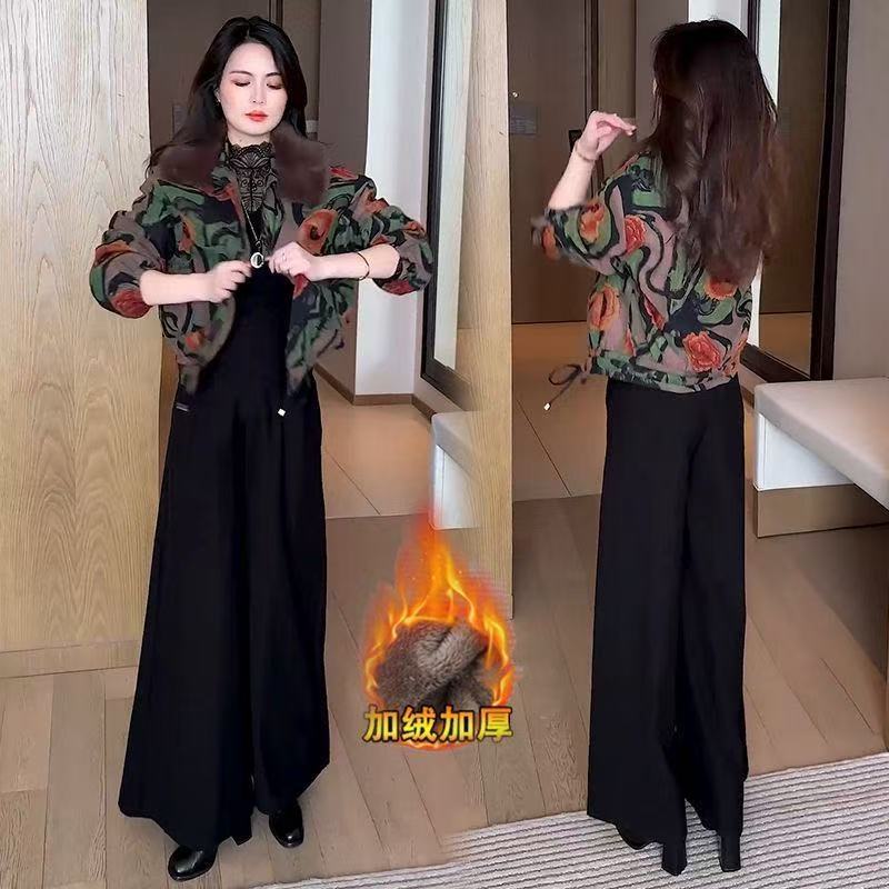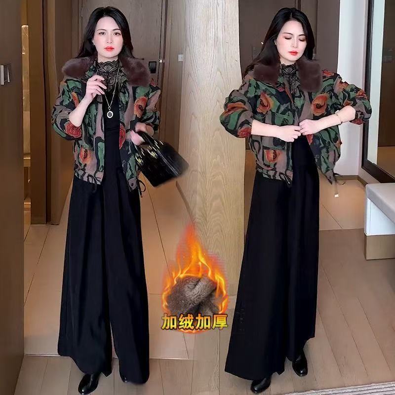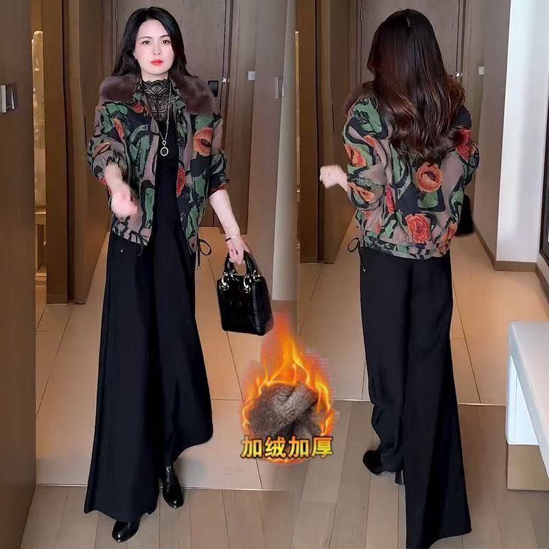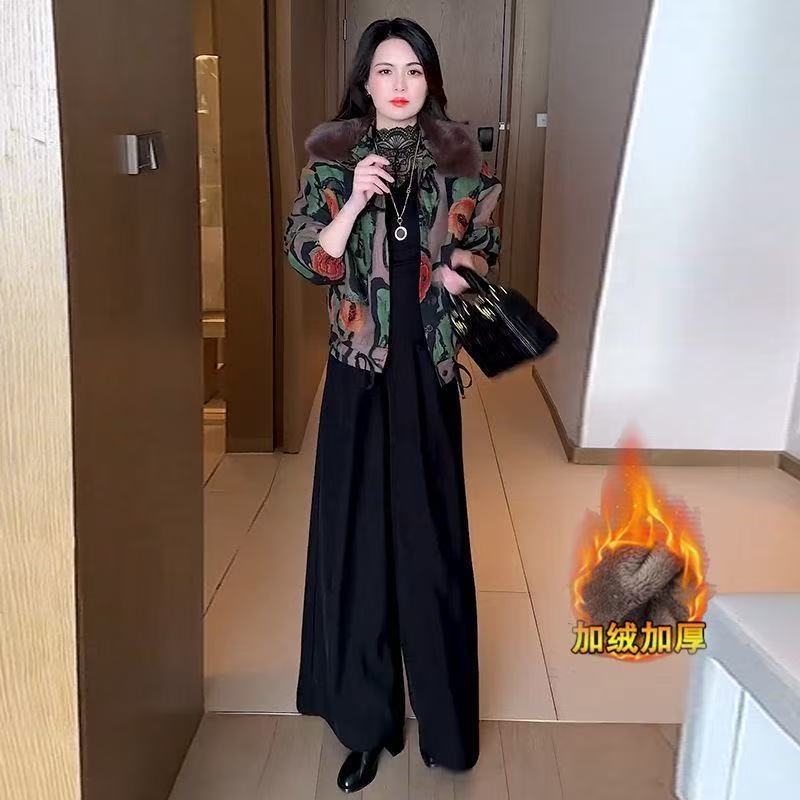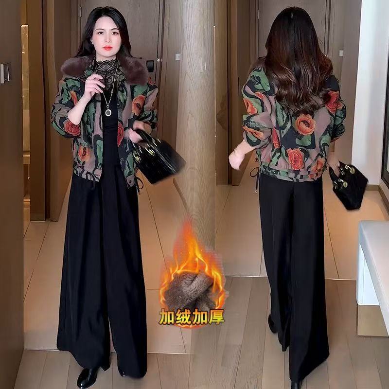 2025冬季新款妈妈印花短外套女加绒加厚洋气休闲百搭保暖夹克上衣